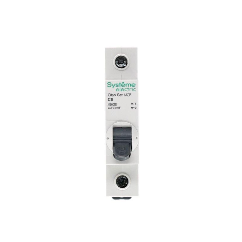 Автоматический выключатель серии City9 Set Systeme Electric, 1-полюсный, номинальный ток 6 А, характеристика С, Icn = 4.5 кА. Применяется в электрических сетях напряжением 230 В. Предназначен для защиты от перегрузок и токов короткого замыкания. Оснащен механизмом «мгновенной коммутации». Ударопрочный корпус из специального пластика с 6 металлическими заклепками. Безопасные клеммы исключают попадание кабелей в заклеммное пространство (ранее Schneider Electric EZ9F34106).