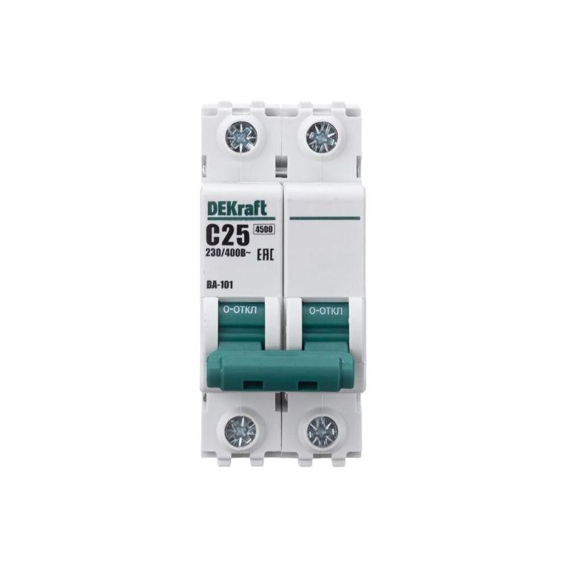 Автоматический выключатель серии ВА-101 Dekraft; 2P; номинальный ток 25 А; характеристика С; отключающая способность 4,5 кА. 5 монолитных заклепок повышают прочность корпуса аппарата. Сплошная лицевая панель обеспечивает безопасность эксплуатации аппарата. Боковые каналы охлаждения повышают стабильность работы при высоких температурах окружающей среды. Есть возможность установки дополнительных аксессуаров с левой стороны устройства. Аппарат на 100% совместим с корпусами Dekraft и Systeme Electric.