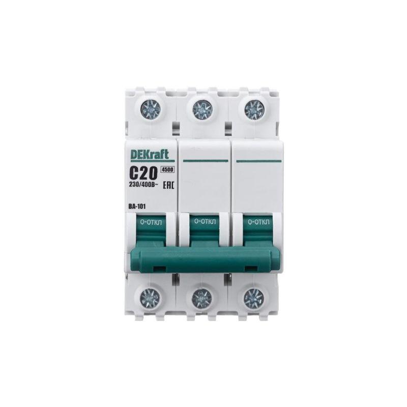 Автоматический выключатель серии ВА-101 Dekraft; 3P; номинальный ток 20 А; характеристика С; отключающая способность 4,5 кА. 5 монолитных заклепок повышают прочность корпуса аппарата. Сплошная лицевая панель обеспечивает безопасность эксплуатации аппарата. Боковые каналы охлаждения повышают стабильность работы при высоких температурах окружающей среды. Есть возможность установки дополнительных аксессуаров с левой стороны устройства. Аппарат на 100% совместим с корпусами Dekraft и Systeme Electric.