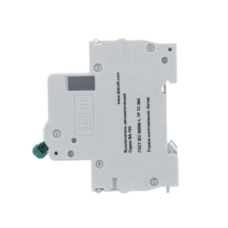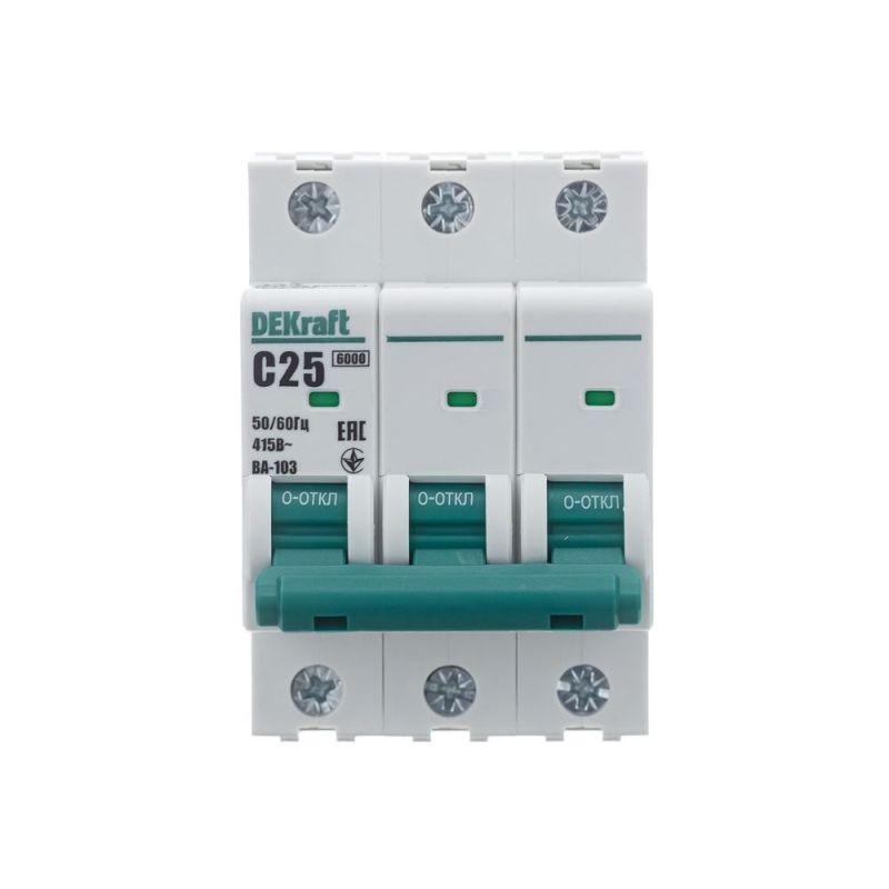 Автоматический выключатель серии ВА-103 NEW Dekraft; 3P; номинальный ток 25 А; характеристика C; отключающая способность 6 кА, что позволяет использовать аппараты в качестве вводных. 5 монолитных заклепок повышают прочность корпуса аппарата. Окошко-индикатор всегда показывает состояние контактов вне зависимости от положения рукоятки управления. Боковые каналы охлаждения повышают стабильность работы при высоких температурах окружающей среды. Есть возможность установки дополнительных аксессуаров с левой стороны устройства. Аппарат на 100% совместим с корпусами и оболочками Dekraft, Systeme Electric.