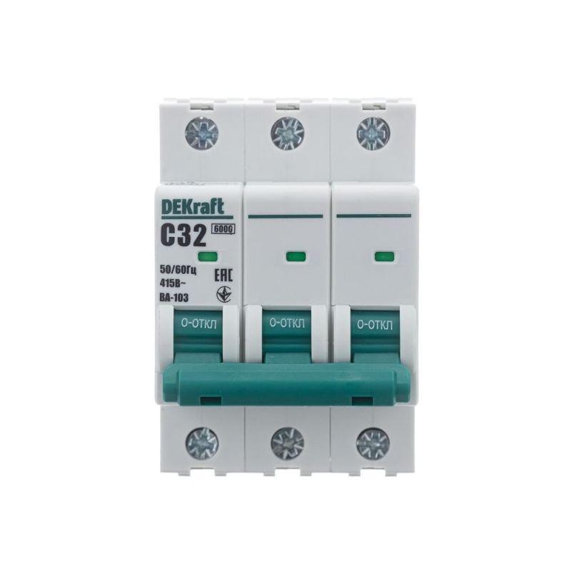 Автоматический выключатель серии ВА-103 NEW Dekraft; 3P; номинальный ток 32 А; характеристика C; отключающая способность 6 кА, что позволяет использовать аппараты в качестве вводных. 5 монолитных заклепок повышают прочность корпуса аппарата. Окошко-индикатор всегда показывает состояние контактов вне зависимости от положения рукоятки управления. Боковые каналы охлаждения повышают стабильность работы при высоких температурах окружающей среды. Есть возможность установки дополнительных аксессуаров с левой стороны устройства. Аппарат на 100% совместим с корпусами и оболочками Dekraft, Systeme Electric.