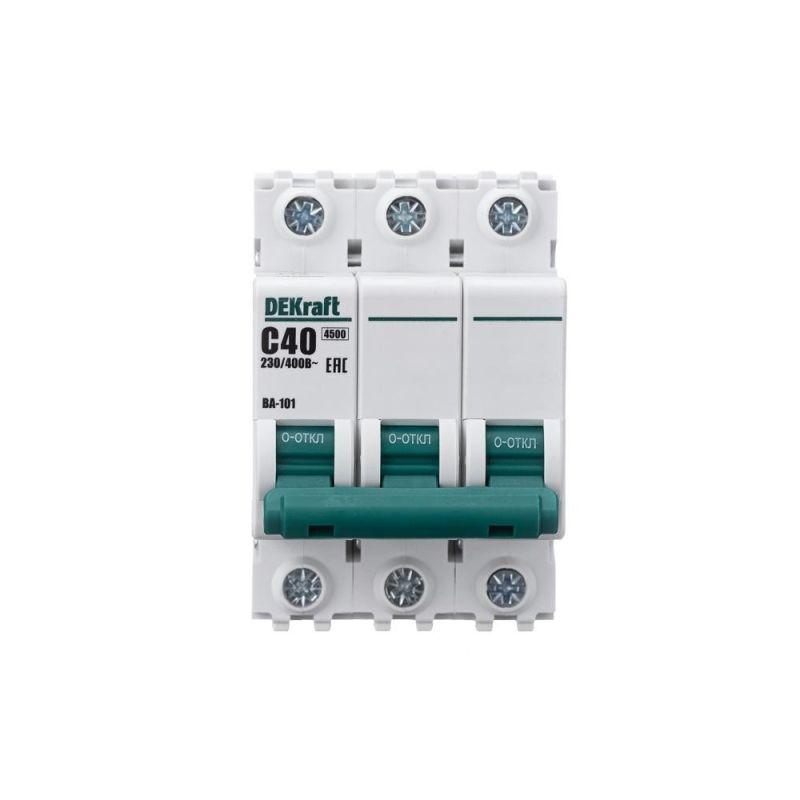 Автоматический выключатель серии ВА-101 Dekraft; 3P; номинальный ток 40 А; характеристика С; отключающая способность 4,5 кА. 5 монолитных заклепок повышают прочность корпуса аппарата. Сплошная лицевая панель обеспечивает безопасность эксплуатации аппарата. Боковые каналы охлаждения повышают стабильность работы при высоких температурах окружающей среды. Есть возможность установки дополнительных аксессуаров с левой стороны устройства. Аппарат на 100% совместим с корпусами Dekraft и Systeme Electric.
