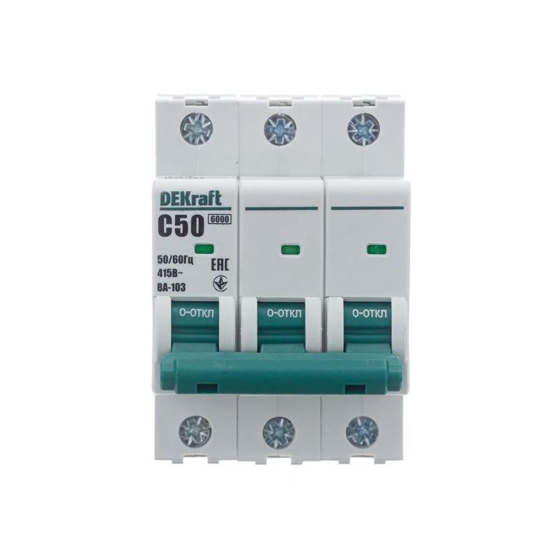 Автоматический выключатель серии ВА-103 NEW Dekraft; 3P; номинальный ток 50 А; характеристика C; отключающая способность 6 кА, что позволяет использовать аппараты в качестве вводных. 5 монолитных заклепок повышают прочность корпуса аппарата. Окошко-индикатор всегда показывает состояние контактов вне зависимости от положения рукоятки управления. Боковые каналы охлаждения повышают стабильность работы при высоких температурах окружающей среды. Есть возможность установки дополнительных аксессуаров с левой стороны устройства. Аппарат на 100% совместим с корпусами и оболочками Dekraft, Systeme Electric.