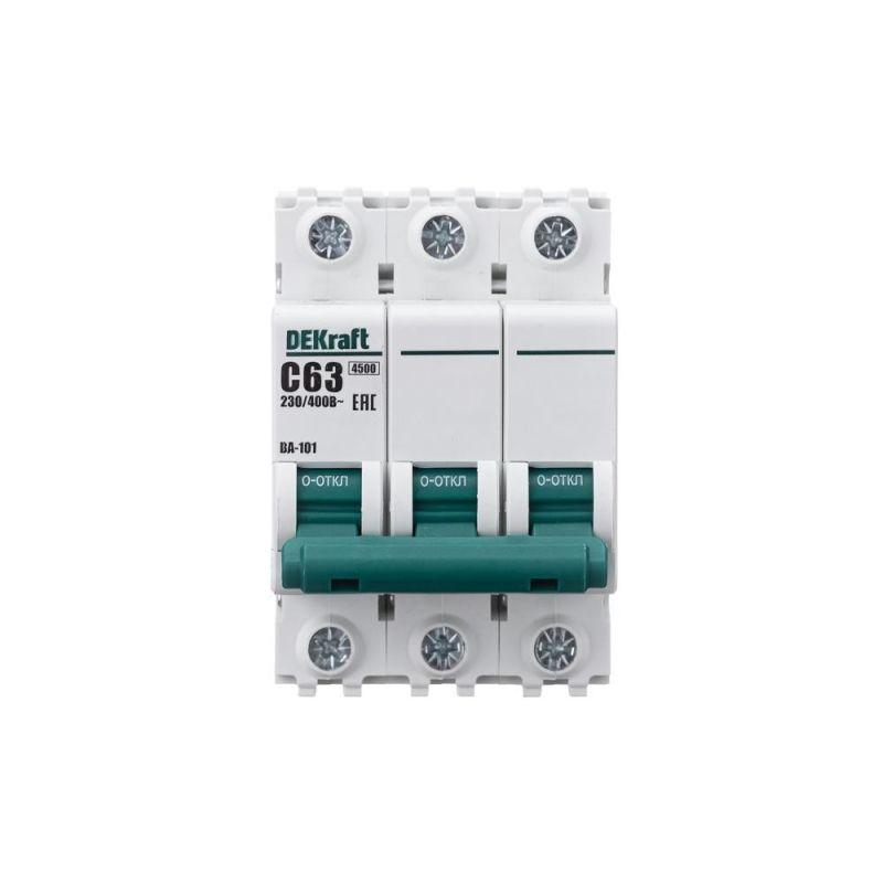 Автоматический выключатель серии ВА-101 Dekraft; 3P; номинальный ток 63 А; характеристика С; отключающая способность 4,5 кА. 5 монолитных заклепок повышают прочность корпуса аппарата. Сплошная лицевая панель обеспечивает безопасность эксплуатации аппарата. Боковые каналы охлаждения повышают стабильность работы при высоких температурах окружающей среды. Есть возможность установки дополнительных аксессуаров с левой стороны устройства. Аппарат на 100% совместим с корпусами Dekraft и Systeme Electric.