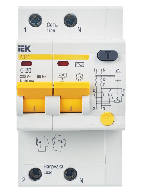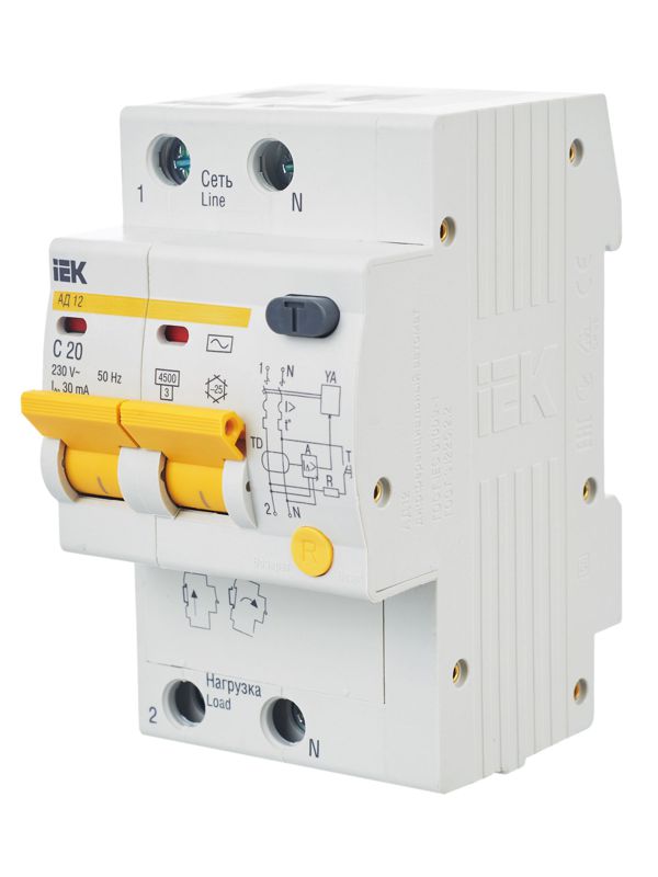 Выключатель авт. дифф. тока 2п C 20А 30мА тип AC 4.5кА АД-12 3.5мод. IEK MAD10-2-020-C-030
