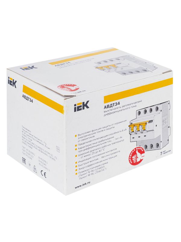 Автоматические выключатели дифференциального тока АВДТ34 предназначены для защиты человека от поражения электрическим током при повреждении изоляции электроустановок, для предотвращения пожаров вследствие протекания токов утечки на землю и для защиты от перегрузки и короткого замыкания в сетях переменного тока напряжением 400 В и частотой 50 Гц.