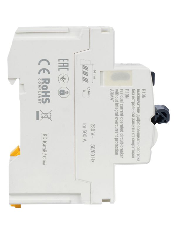 Выключатели дифференциального тока ARMAT серии R10N выполняют функцию защиты поражения человека электрическим током, а так же защиты от пожара при возникновении замыкания на землю. Модельный ряд включает в себя устройства с типами защитных характеристик по дифференциальному току AC, A, AC-S, A-S; номинальными токами от 25 до 100 А; номинальными дифференциальными токами срабатывания от 10 до 300мА. Условная отключающая способность ВДТ ARMAT серии R10N составляет 10 кА.
