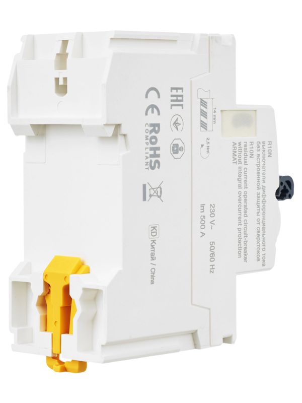 Выключатели дифференциального тока ARMAT серии R10N выполняют функцию защиты поражения человека электрическим током, а так же защиты от пожара при возникновении замыкания на землю. Модельный ряд включает в себя устройства с типами защитных характеристик по дифференциальному току AC, A, AC-S, A-S; номинальными токами от 25 до 100 А; номинальными дифференциальными токами срабатывания от 10 до 300мА. Условная отключающая способность ВДТ ARMAT серии R10N составляет 10 кА.