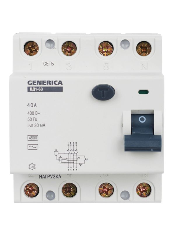 Быстродействующий защитный выключатель ВД1-63 (УЗО) GENERICA - устройство электронного типа, зависящее от напряжения и реагирующее на дифференциальный ток, без встроенной защиты от сверхтоков. Предназначен для защиты человека от поражения электрическим током.