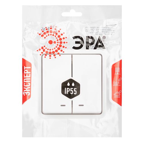 Выключатель влагозащищённый 2-клавишный с подсветкой серии Эра Эксперт накладн IP55 цвет белый 11-1525-01 открытой установки. Номинальные характеристики 10А 250В . Выполнен из качественного поликарбоната, оснащён уникальными винтовыми клеммами ЭКСПЕРТ для максимально качественного зажима кабеля в механизме.