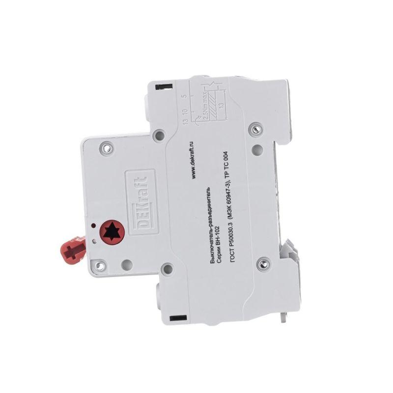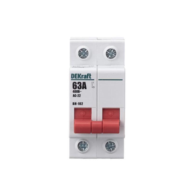Выключатель-разъединитель серии ВН-102 Dekraft; 2P; номинальный ток 63 А; установка – на DIN-рейку; установочное положение - любое. Выключатели-разъединители применяются для ручного включения/отключения сетей напряжением до 400 В. Специальные мостиковые контакты обеспечивают надежный разрыв цепи; они полностью исключают возможность перекрытия дугой по изоляции. Усиленная рукоятка управления обеспечивает большое количество включений/отключений.