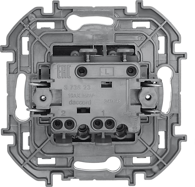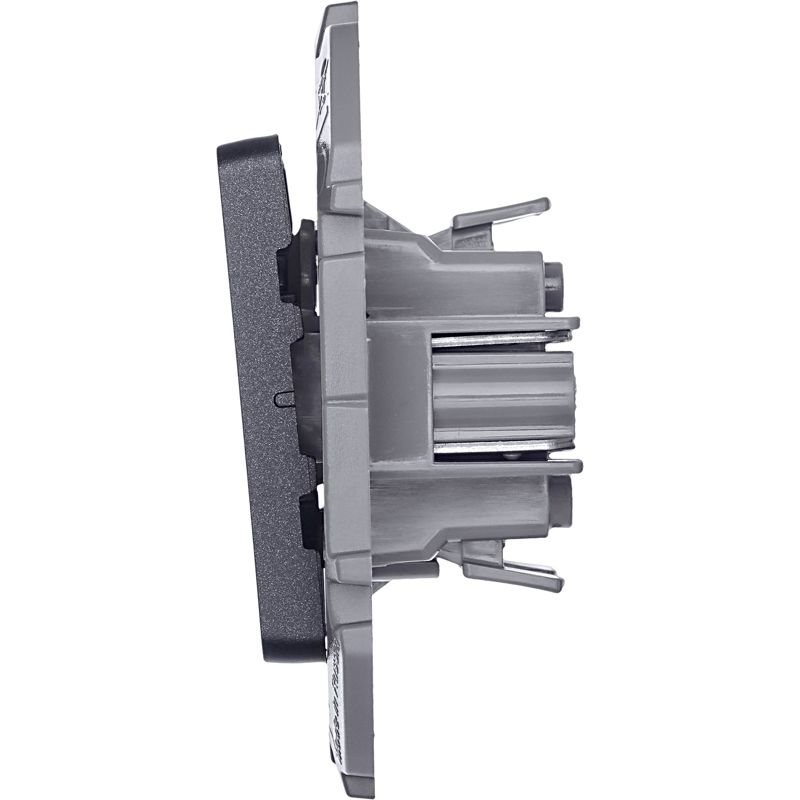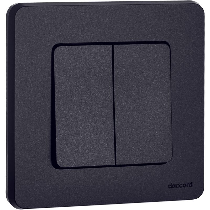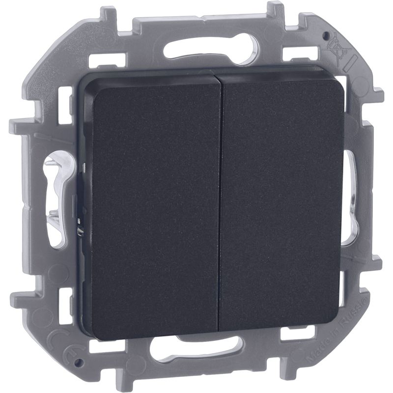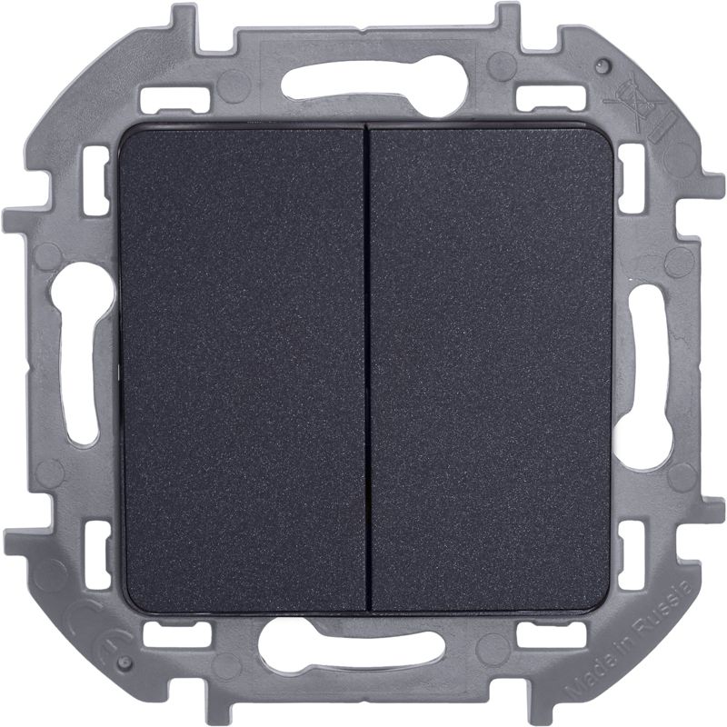 Выключатель двухклавишный скрытого монтажа Inspiria, цвет "Антрацит", номинальный ток 10АХ, напряжение ~250В, безвинтовые зажимы. Устанавливается в жилых и общественных помещениях для управления приборами освещения, вентиляции и т.д. Предназначен для управления двумя электрическими цепями.