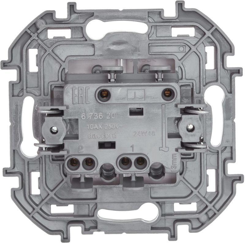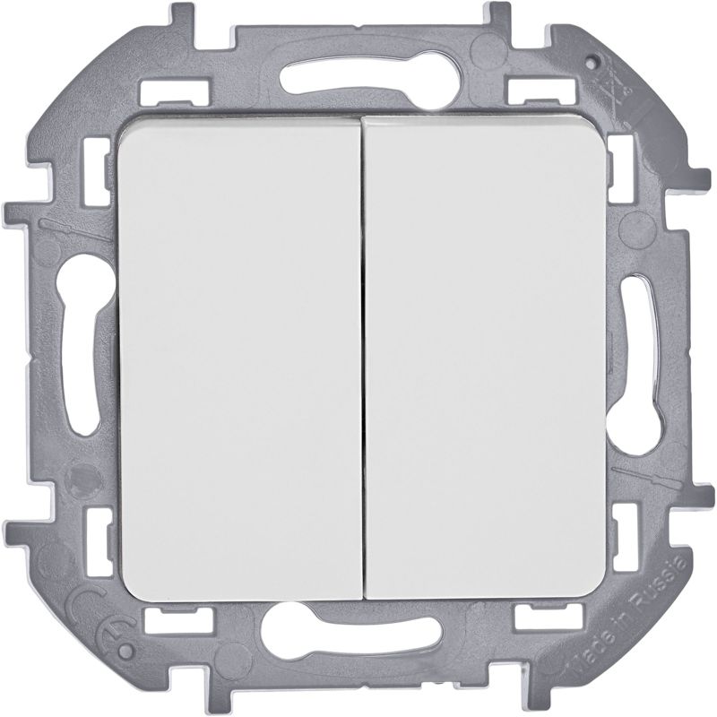 Выключатель двухклавишный скрытого монтажа Inspiria, цвет "Белый", номинальный ток 10АХ, напряжение ~250В, безвинтовые зажимы. Устанавливается в жилых и общественных помещениях для управления приборами освещения, вентиляции и т.д. Предназначен для управления двумя электрическими цепями.
