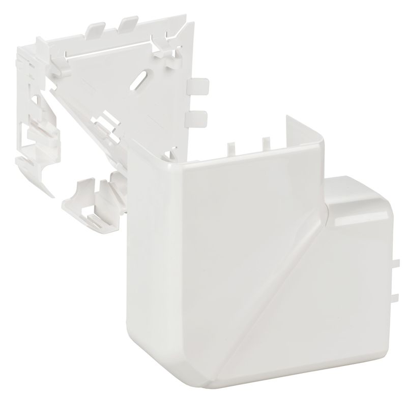 Угол защёлкивается на корпус кабель-канала. Допускается установка на кабель-каналы с разделительными/несущими перегородками или без них. Цвет: белый