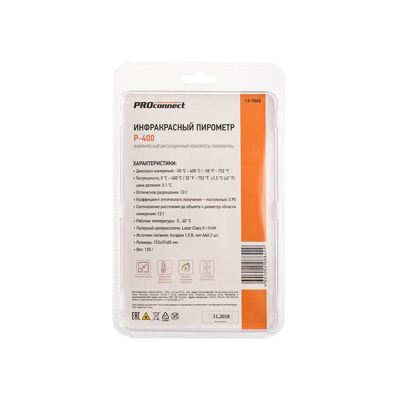 Пирометр PROconnect P-400 — это прибор, предназначенный для бесконтактного дистанционногоизмерения температуры различных объектов. Принцип действия построен на измерении уровня теплового излучения объекта в диапазонах инфракрасного излучения. Пирометры применяются в сферах ЖКХ, промышленности, на предприятиях, в бытовых целях и везде, где большое значение приобретает контроль температур. Приборы такого типа необходимы в роли средств безопасности и контроля температурных норм в различных технологических и производственных сферах, так как физическое взаимодействие с объектом измерения не нужно и полностью отсутствует возможность получения ожога или других связанных с большими температурами травм.