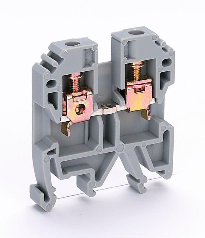Зажим наборный серии ЗН-101 Dekraft ; номинальный ток - 35 А; сечение проводов от 1 до 4 кв.мм; цвет – серый; материал корпуса - полиамид; материал клемм и винтов – латунь; монтаж - защелкиванием на DIN-рейку; количество в упаковке – 50 шт. Клемма выполнена таким образом, что обеспечивает двойной обжим проводника. Это обеспечивается в том числе и за счет насечек на клеммах. Флажок под зажимом предотвращает случайную установку проводника ниже зажима.