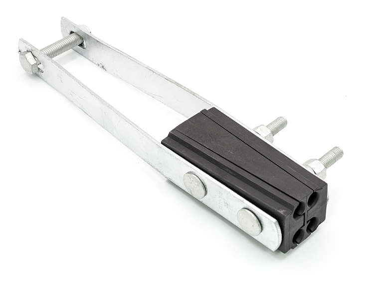 Зажим крепится на крюках и кронштейнах с помощью единственного болта. Прижимная часть клинового типа является саморегулируемой. Клинья легко раздвигаются благодаря пружине, что облегчает установку проводов.