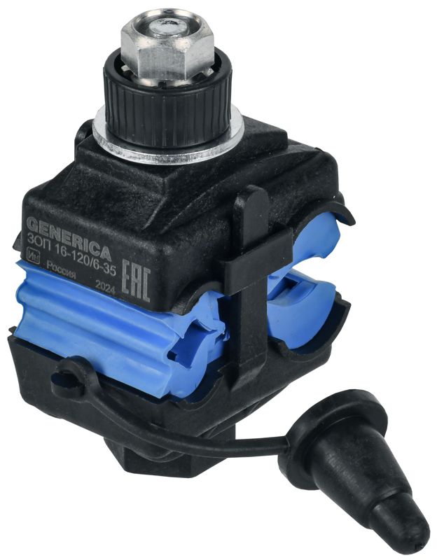 Зажимы ЗОП ТМ GENERICA предназначены для подключения провода СИП к магистральной неизолированной линии. Применимы для алюминиевых и медных проводников напряжением до 1 кВ., а также для ответвления абонентских проводников (проводов освещения). При затягивании болтов ножи контактной пластины образуют надежный электрический контакт, прокалывая изоляцию проводника ответвления. При достижении определенного усилия, достаточного для создания надежного электрического контакта, происходит срыв головки затягиваемого болта. Корпус зажима выполнен из стеклоармированного полиамида и устойчив к УФ излучению.